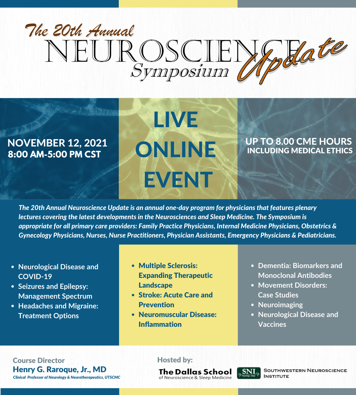 The 20th Annual Neuroscience Update is an annual one-day program for physicians that features plenary lectures covering the latest developments in the Neurosciences and Sleep Medicine. The Symposium is appropriate for all primary care providers: Family Practice Physicians, Internal Medicine Physicians, Obstetrics & Gynecology Physicians, Nurses, Nurse Practitioners, Physician Assistants, Emergency Physicians & Pediatricians.